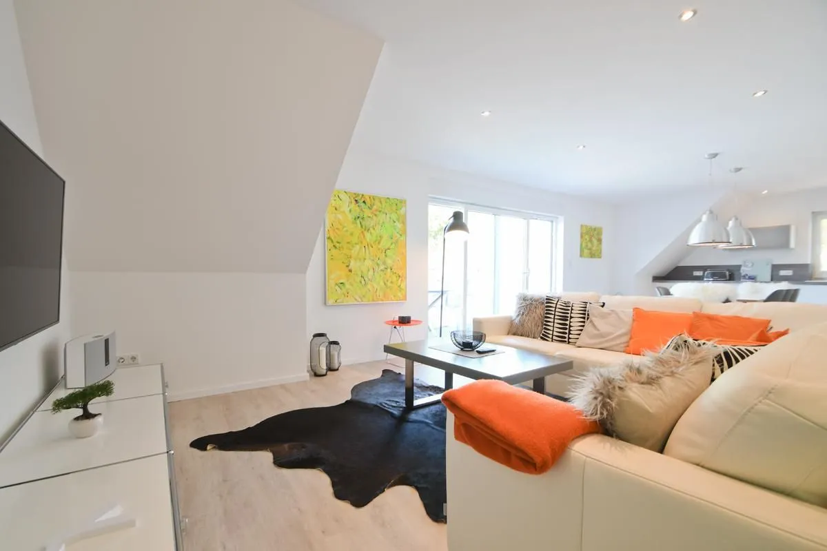 Sie erwartet eine moderne, exklusive, helle und 120 qm Nichtraucher-Wohnung. Diese befindet sich am Nordstrand der Insel und bietet Platz für max. 6 Personen. Diese attraktive Obergeschoss-Wohnung befindet sich in ruhiger und strandnaher Lage. Ca. 10 Minuten fahren Sie mit dem Fahrrad direkt ins Zentrum und sind somit direkt im Geschehen.