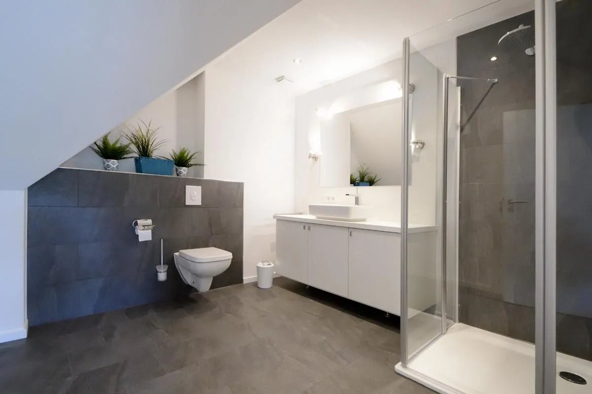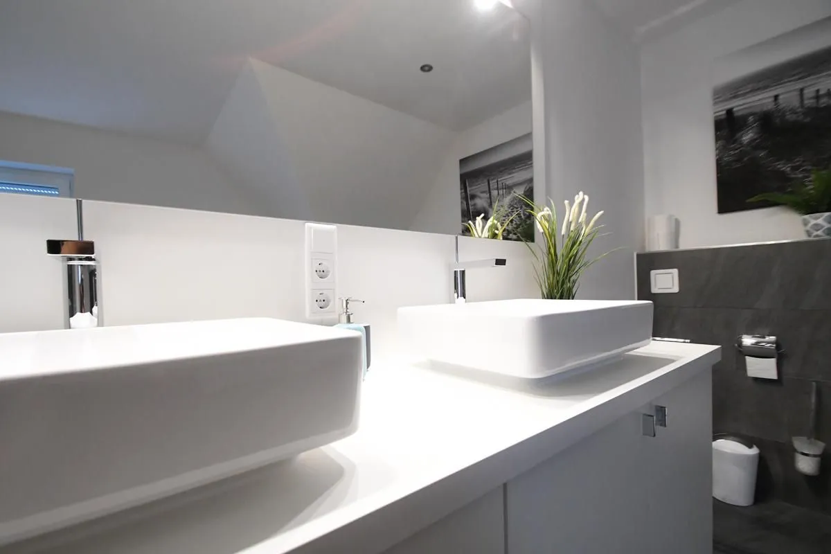 Angrenzend an beiden Schlafzimmern in der Hauptebene (1.OG) befinden sich Ihr eigenes Badezimmer mit einer großen Raindance-Dusche, Badewanne (in einem Bad) und ein bzw. zwei Waschbecken je Bad. Eine Toilette ist ebenfalls in jedem Bad vorhanden.