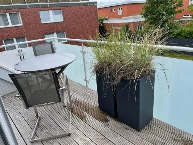 Balkon am Wohn- Essbereich mit einem Gartentisch mit 2 Gartenstühlen, ein Sonnenschirm sind vorhanden. Der Balkon hat eine Südwest-Ausrichtung.