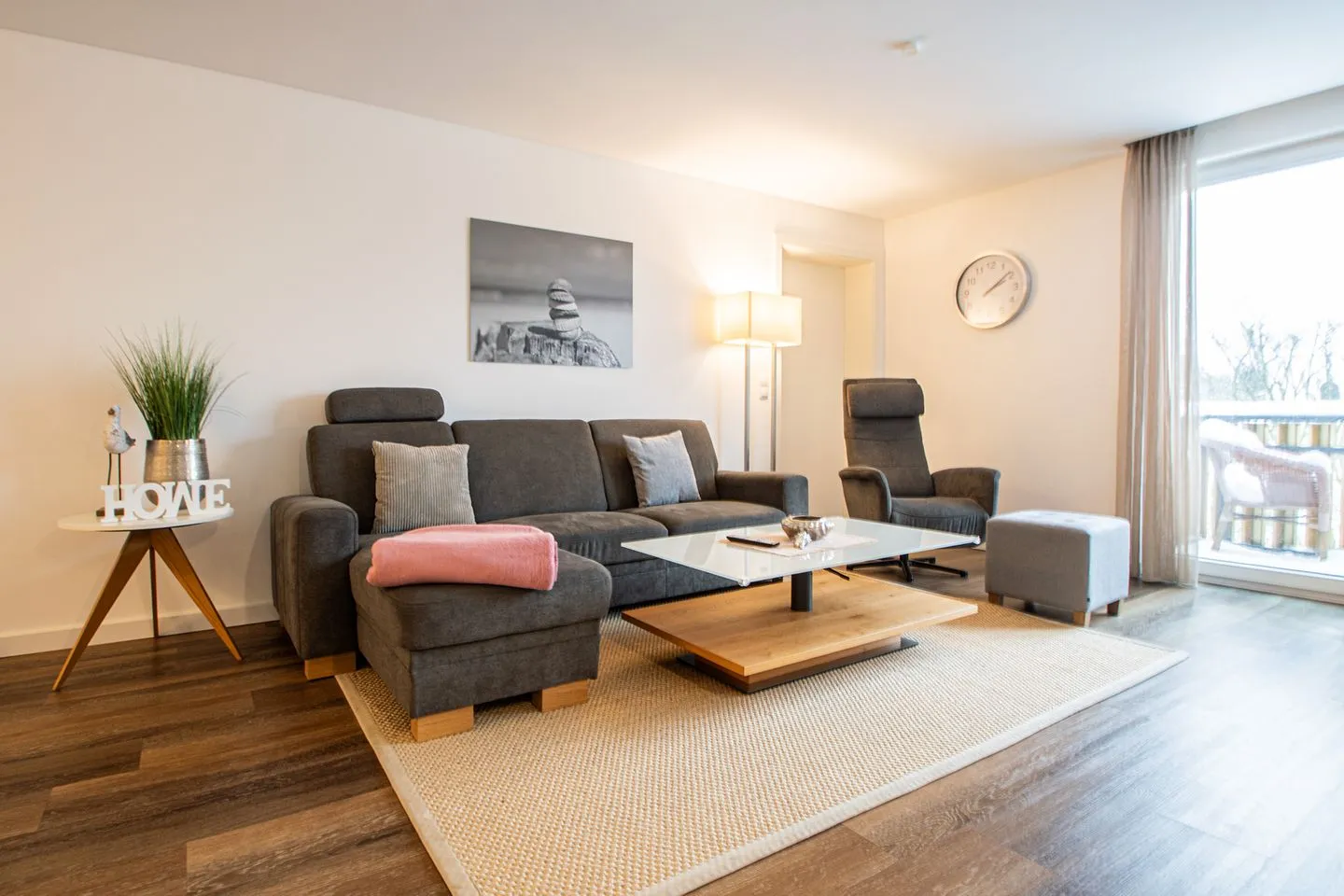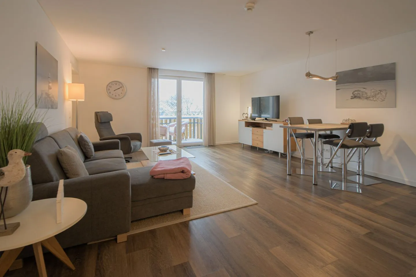 Im Wohnbereich finden Sie eine gemütliche Sofaecke mit Sessel, höhenverstellbaren Wohnzimmertisch, einen 46 Zoll Flachbildfernseher mit BlueRay-Player und einer Kompaktanlage.