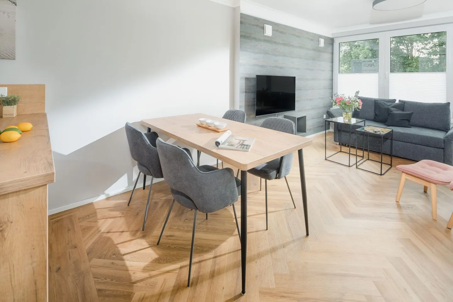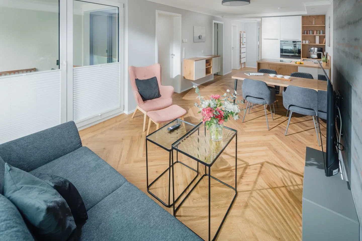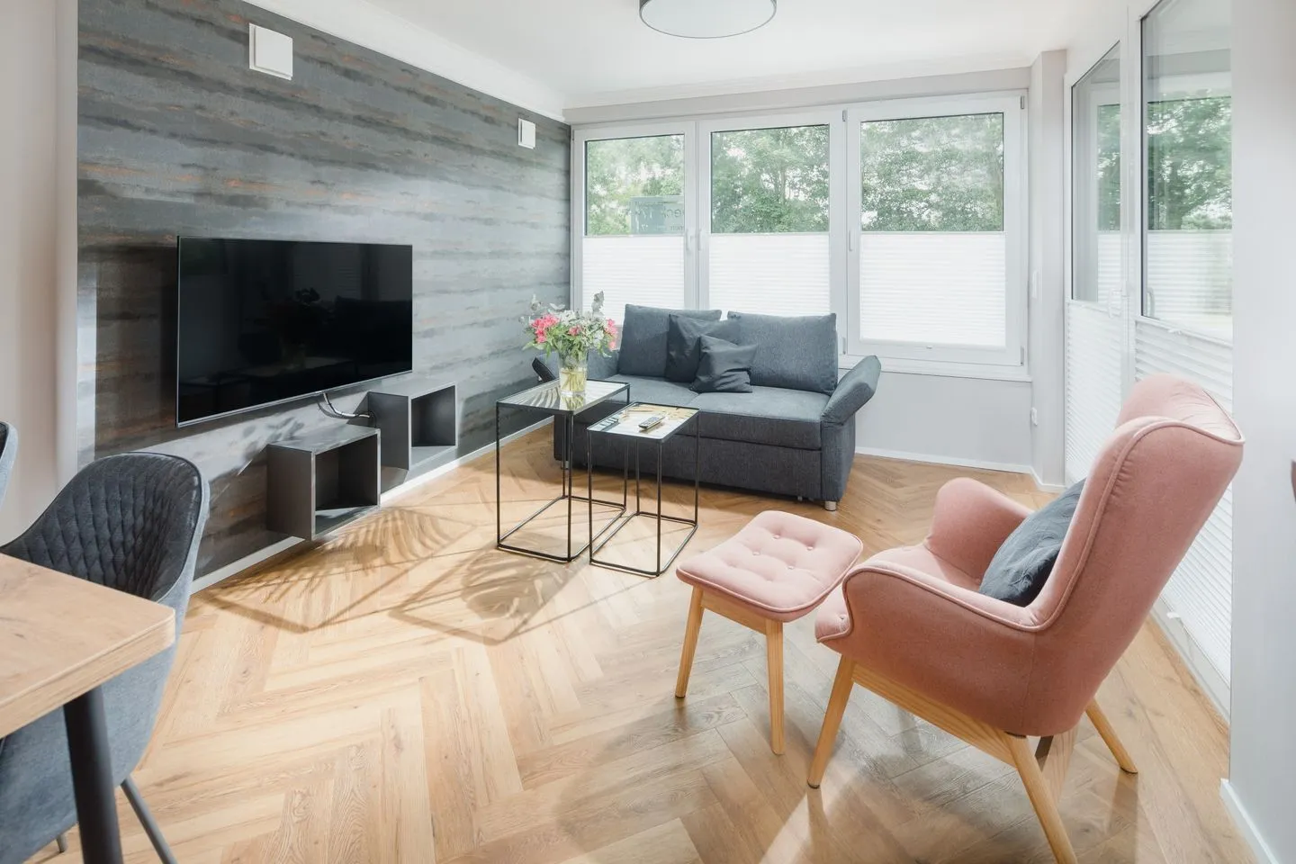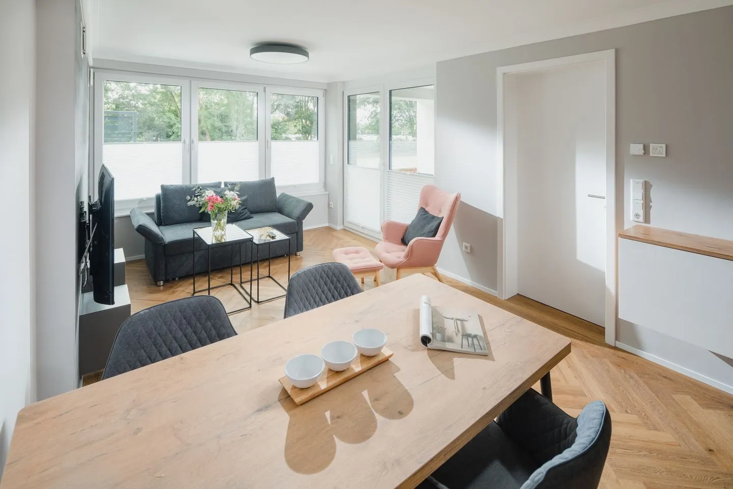Heller Wohnbereich mit großer Fensterfront und Ausgang zur überdachten Terrasse. Gemütliche Wohnlandschaft, Flachbildfernseher und ein Essbereich für 4 Personen.
