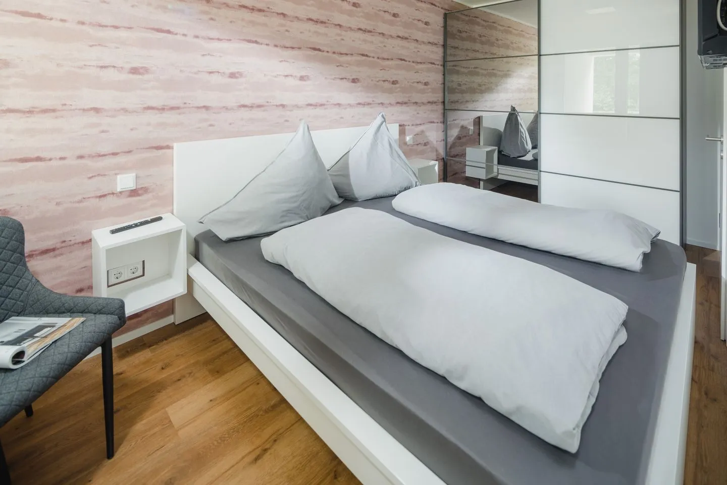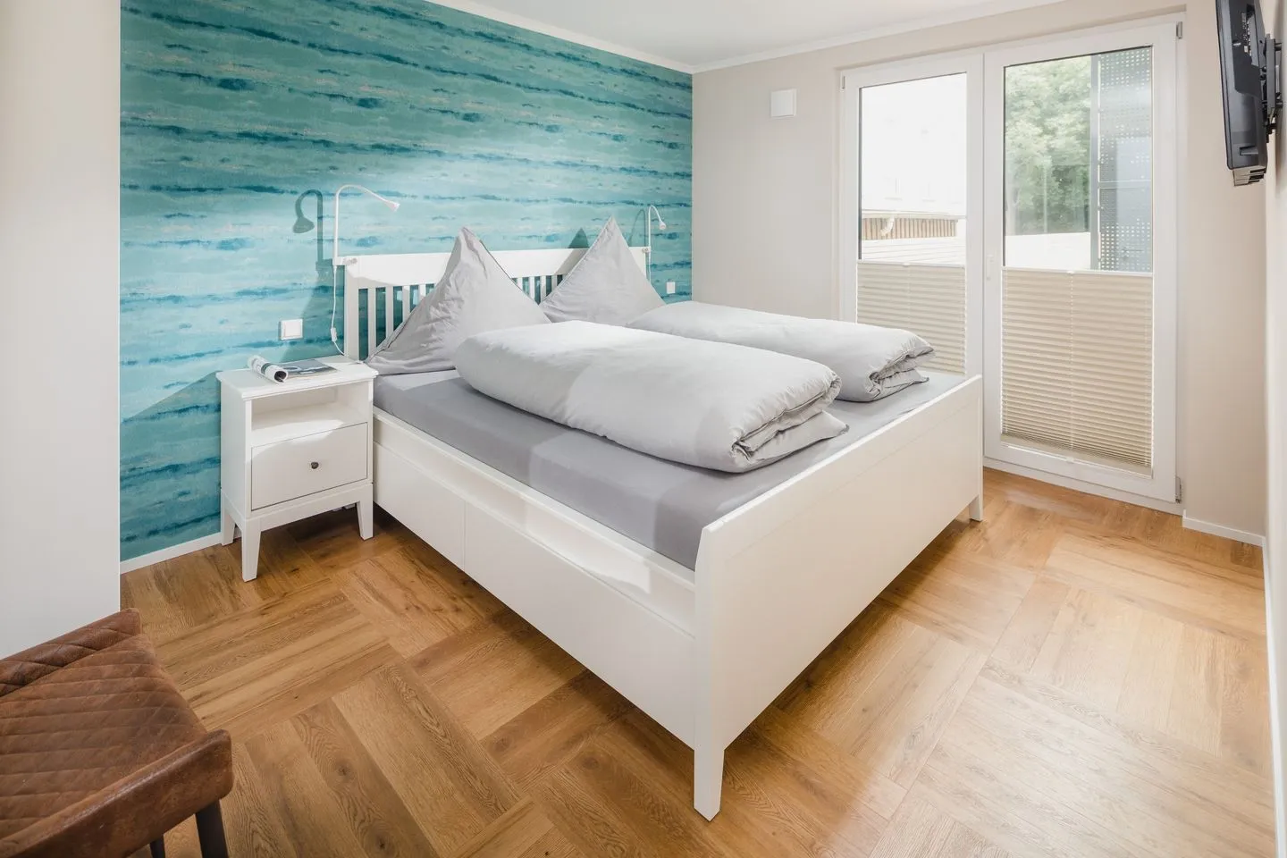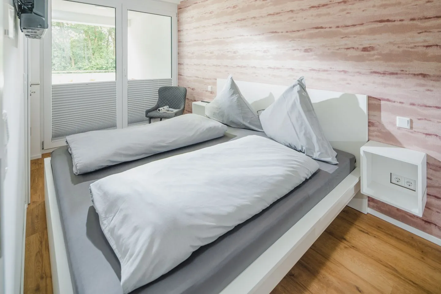 Das Schlafzimmer 1 mit Zugang zur Loggia. Das Schlafzimmer 2 mit Zugang zur Terrasse mit Standkorb. Beide Schlafzimmer können mit Sonnenschutzplissee abgedunkelt werden.