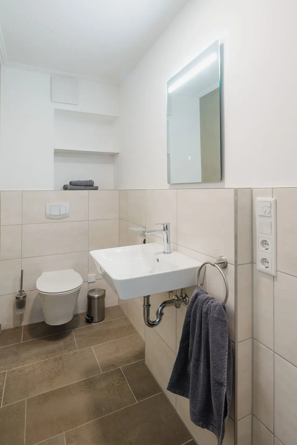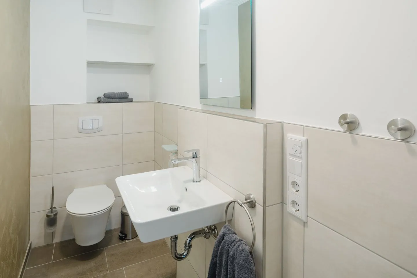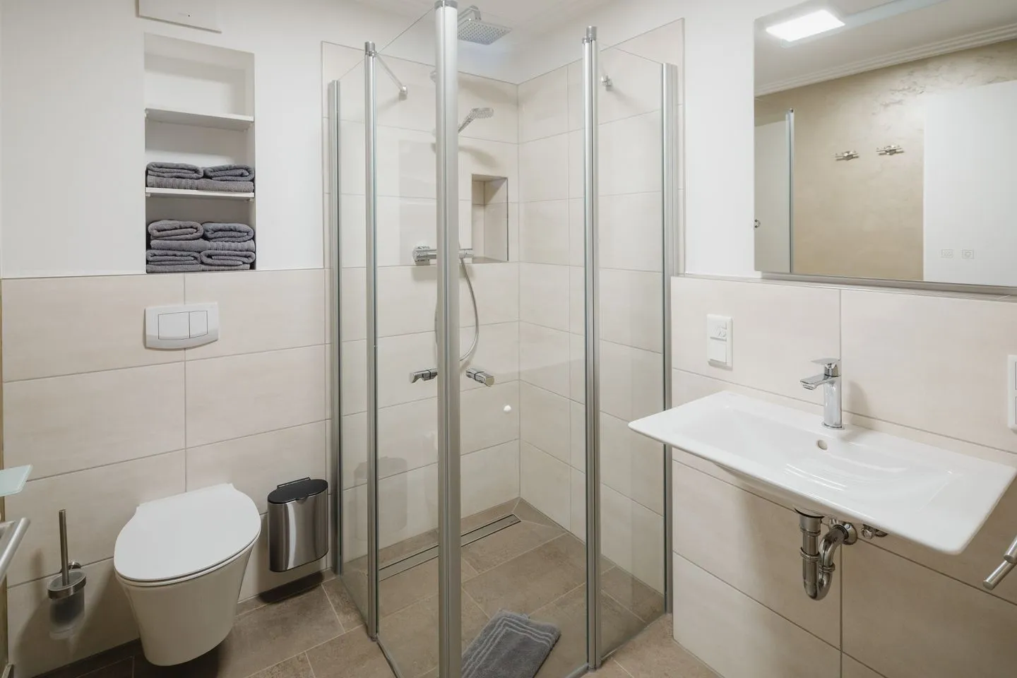 Modernes Badezimmer mit bodengleicher Schauer-Dusche, WC, Waschtisch und Handtuchheizung. Fön/Haartrockner vorhanden. Ihre Ferienwohnung bietet ein separates Gäste-WC.