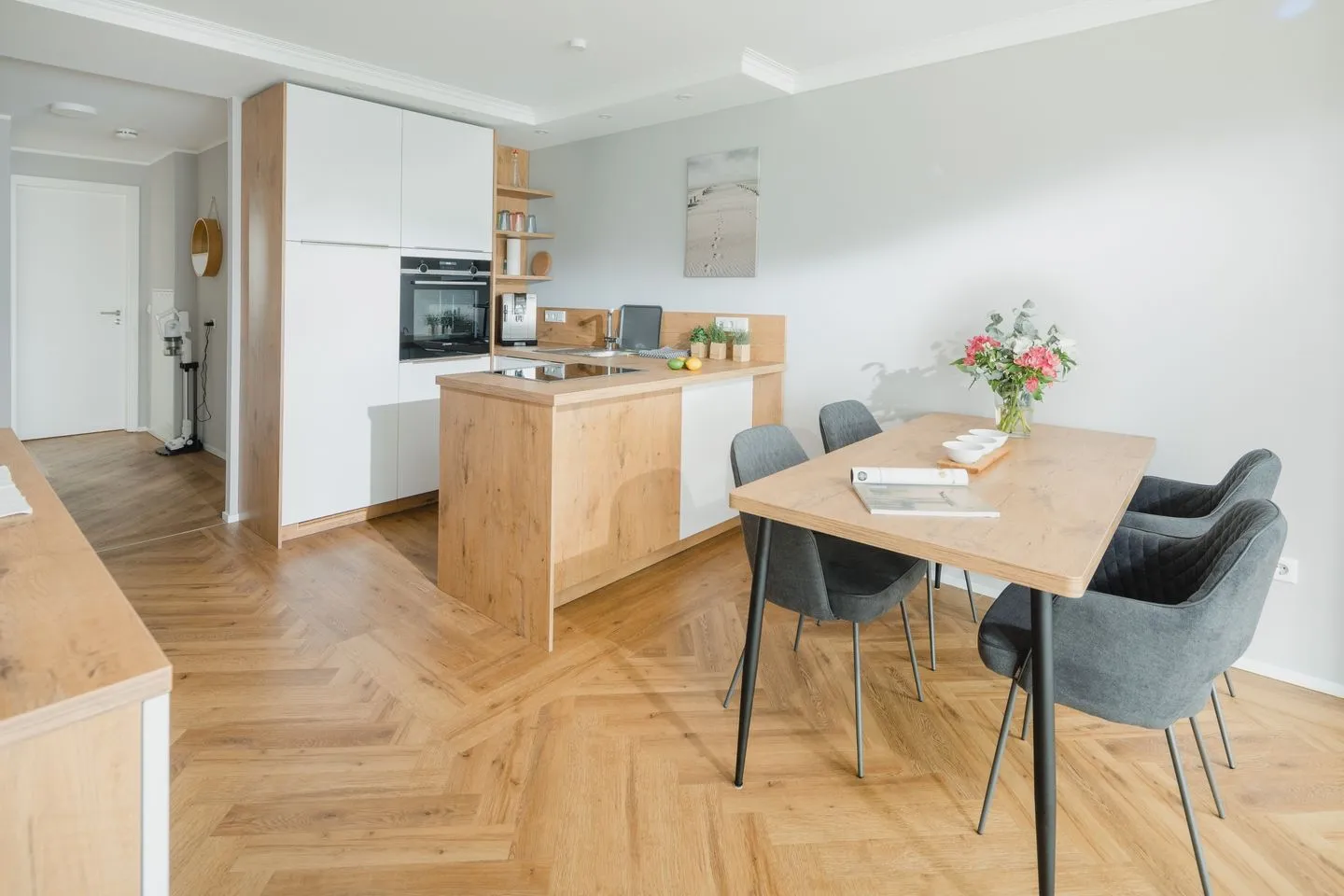 Voll ausgestattete Küche mit Kochtresen, Backofen, Induktionsherd, Kaffeevollautomat und großem Kühlschrank incl. Gefrierfach, Spülmaschine, Eierkocher, Wasserkocher, Toaster und Mixer.