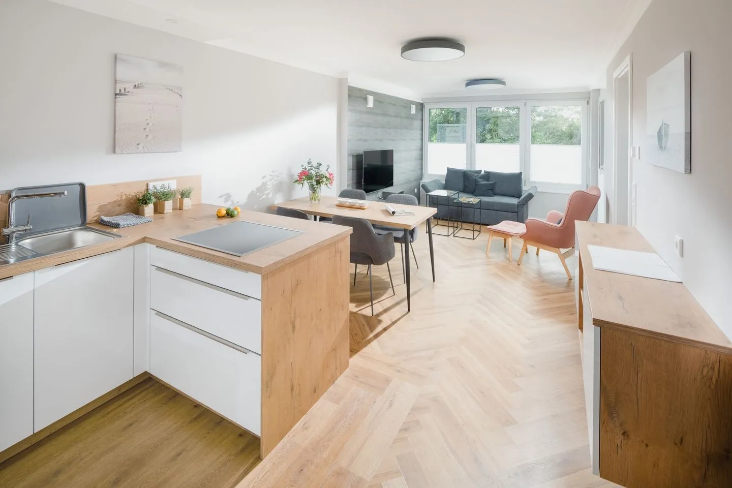 Exklusive und gemütliche Neubau-Ferienwohnung in ruhiger Innenstadtlage Norderneys direkt am Kurpark. Die 2021 fertiggestellte Ferienwohnung im Erdgeschoss bietet auf ca. 62m² eine Wohlfühlatmosphäre auf höchstem Niveau. Ihre Ferienwohnung verfügt über einen großen Wohnbereich mit offener Küche, zwei Schlafzimmern, ein Bad mit Dusche und WC, zusätzlichem Gäste-WC eine überdachte Terrasse (Südostausrichtung) und eine kleine zusätzliche Terrasse hinter dem Haus mit Standkorb.