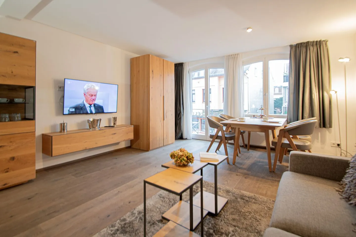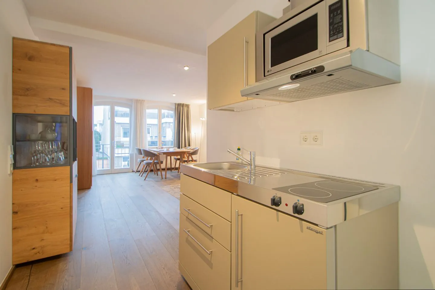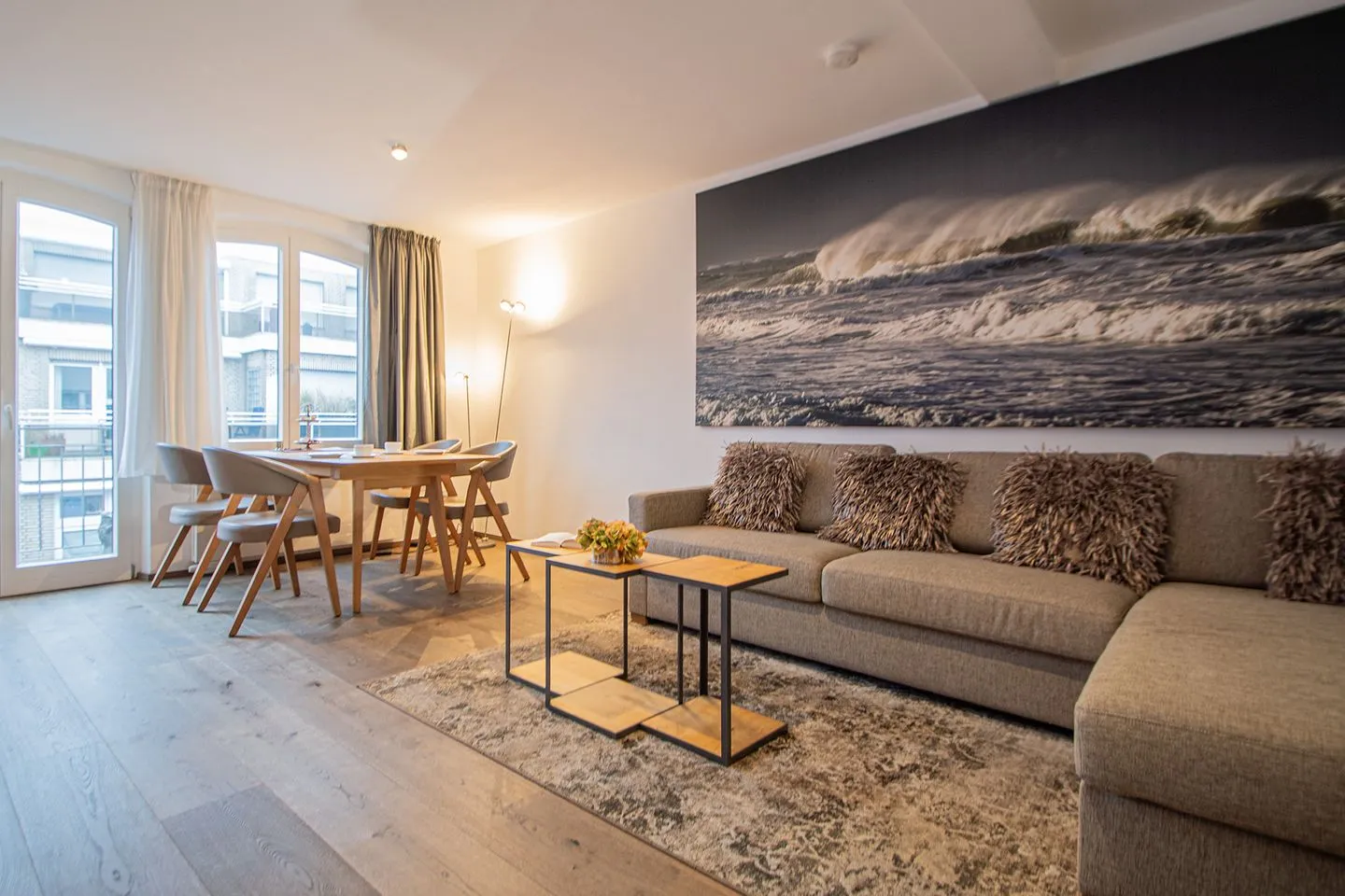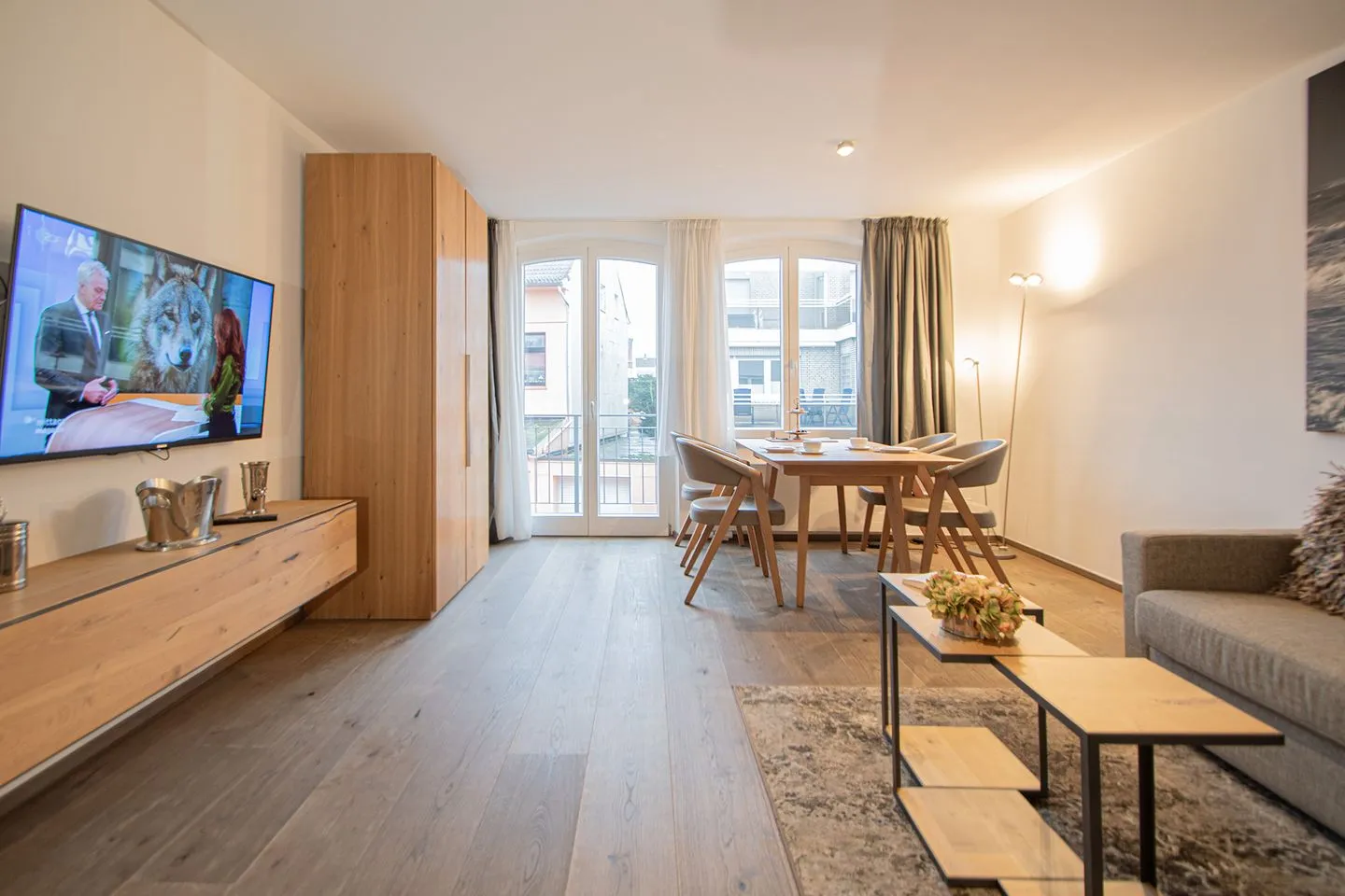 Das moderne Wohnzimmer bildet gemeinsam mit der offenen Küche den zentralen Wohnbereich der Ferienwohnung. Die Sitzecke mit Sofa lädt nach einem Tag am Strand zum Entspannen ein, während der angeschlossene Essbereich gesellige Mahlzeiten ermöglicht. Die vollständig ausgestattete Küchenzeile ist offen zum Wohnzimmer gestaltet und verfügt über einen 2-Platten-Herd, einen Kühlschrank, eine Spülmaschine, einen Wasserkocher, eine Kaffeemaschine, einen Toaster sowie ausreichend Küchenutensilien, Geschirr und Besteck. Ein Esstisch steht bereit und unterstreicht die Funktionalität des Raums. Die Kombination aus offener Küche und Wohnbereich schafft ein großzügiges und gleichzeitig behagliches Ambiente.