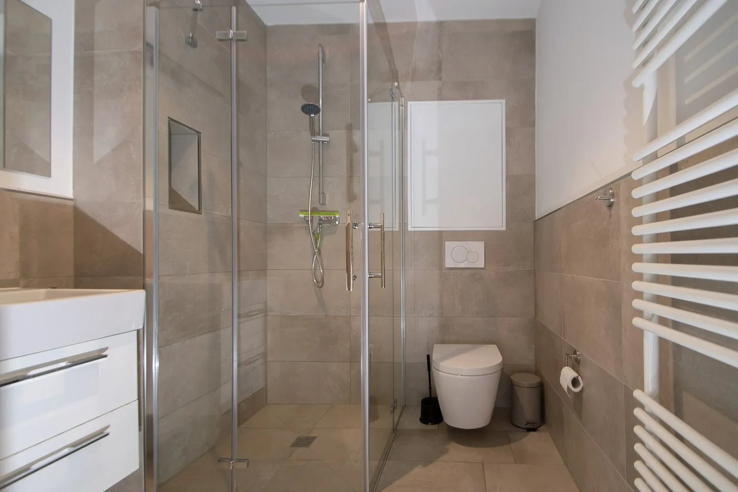 Das ansprechende Badezimmer bietet eine Dusche, Waschbecken, WC, Spiegel sowie Haartrockner, Hand- und Badetücher. Zudem sind ein Staubsauger, ein Bügeleisen und weitere nützliche Ausstattungsdetails vorhanden, um Ihnen den Aufenthalt so angenehm wie möglich zu machen. In der gesamten Ferienwohnung herrscht ein Nichtraucherklima; Rauchmelder sorgen für zusätzliche Sicherheit.